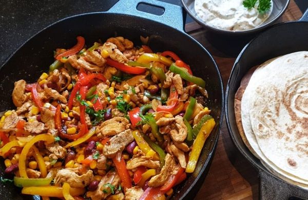 Die fertigen Tortillas nach Packungsanleitung erwärmen und mit der Hähnchen-Gemüse Masse gelegen. Mit geriebenem Käse und einem Dip aus 200 g griech. Joghurt und 2 TL Kräuter Freudetoppen und aufgerollt genießen.